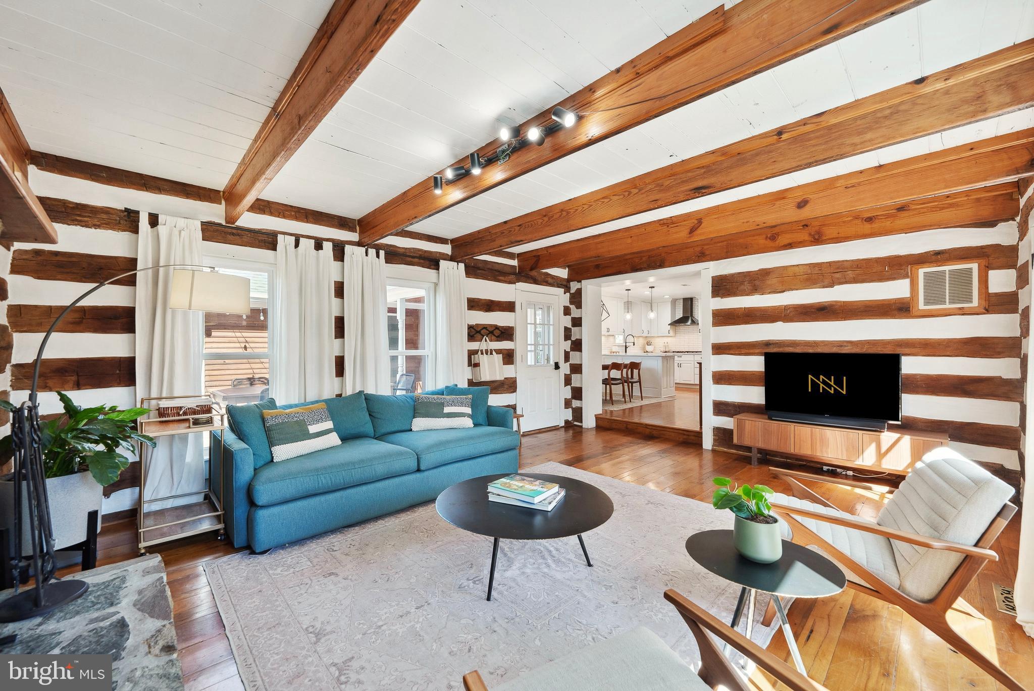 At the heart of the main level is a formal living room with a bay window overlooking the front yard, enhanced by elegant trim work, a wood-burning masonry fireplace, and abundant natural light. French doors open to a private study or library, complete with custom built-ins and a warm pine desk that echoes the earthy tones found throughout the home. Across the foyer, the formal dining room showcases another bay window and provides direct access to the fully renovated gourmet kitchen (2020), featuring quartz countertops, custom cabinetry with under-cabinet lighting, black stainless steel appliances with gas cooking, and a cozy breakfast room with built-in bench seating. Off the breakfast area, step into the show-stopping log cabin-style family room, highlighted by exposed beams, stacked wood walls with authentic chinking, and a storybook stone fireplace. This space opens to two separate decks, perfect for al fresco dining or entertaining under the stars. The walk-out lower level, fully renovated in 2020, offers a spacious recreation area, guest accommodations, a full bathroom, and generous storage with both a walk-in closet and a shelved utility area.