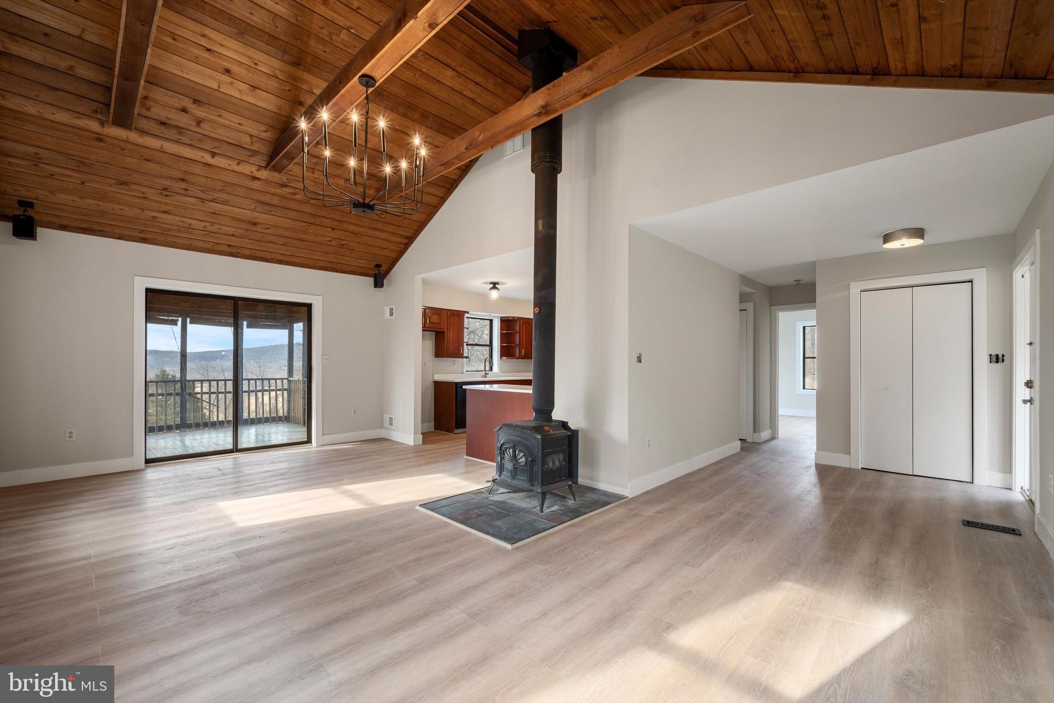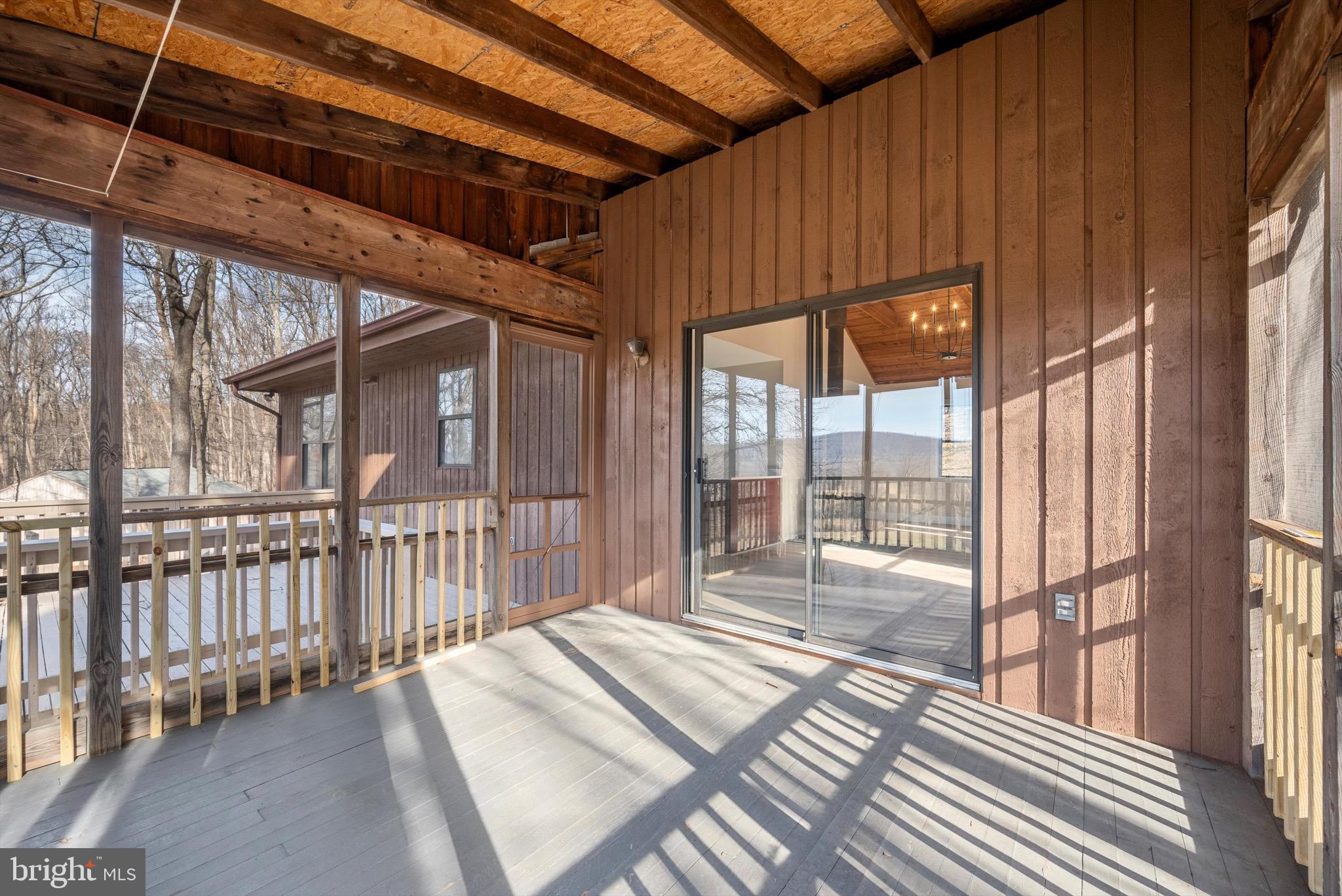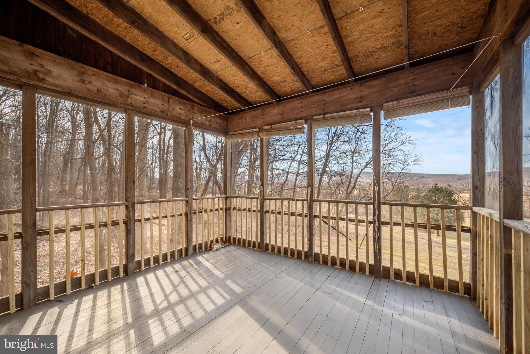 The family room is a highlight, with its cathedral ceiling adorned with wood planks, creating a warm and inviting atmosphere. Enjoy the mountain views from the screened-in porch or the deck.