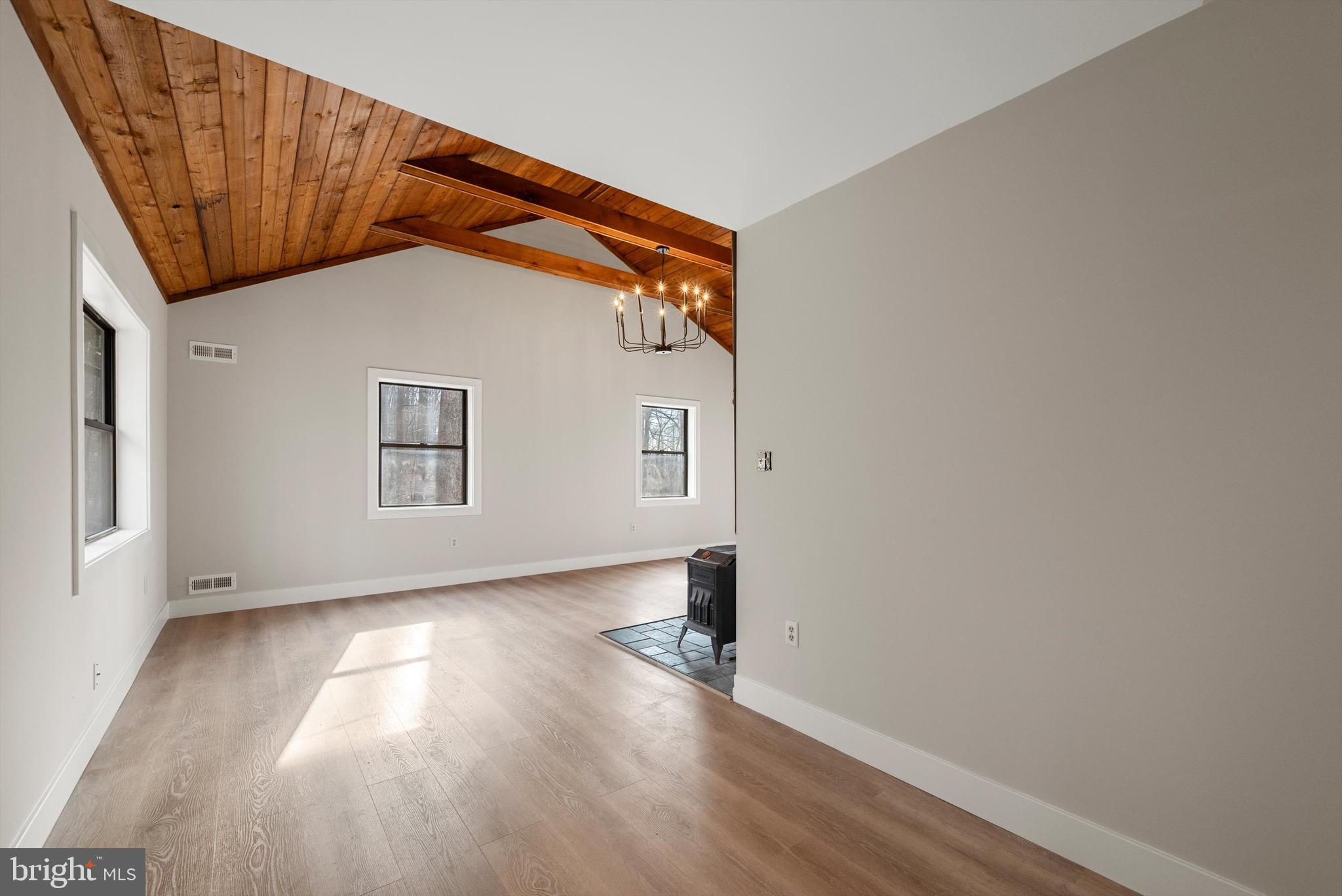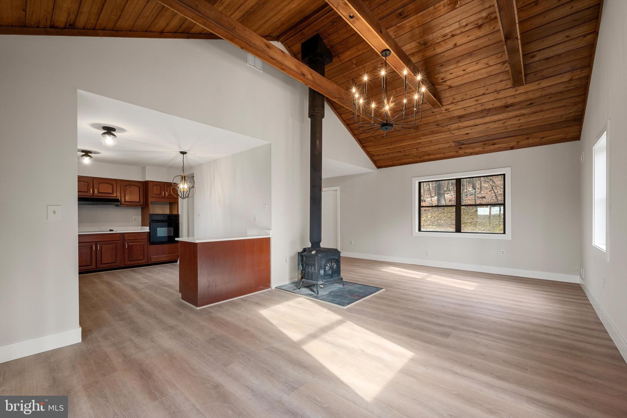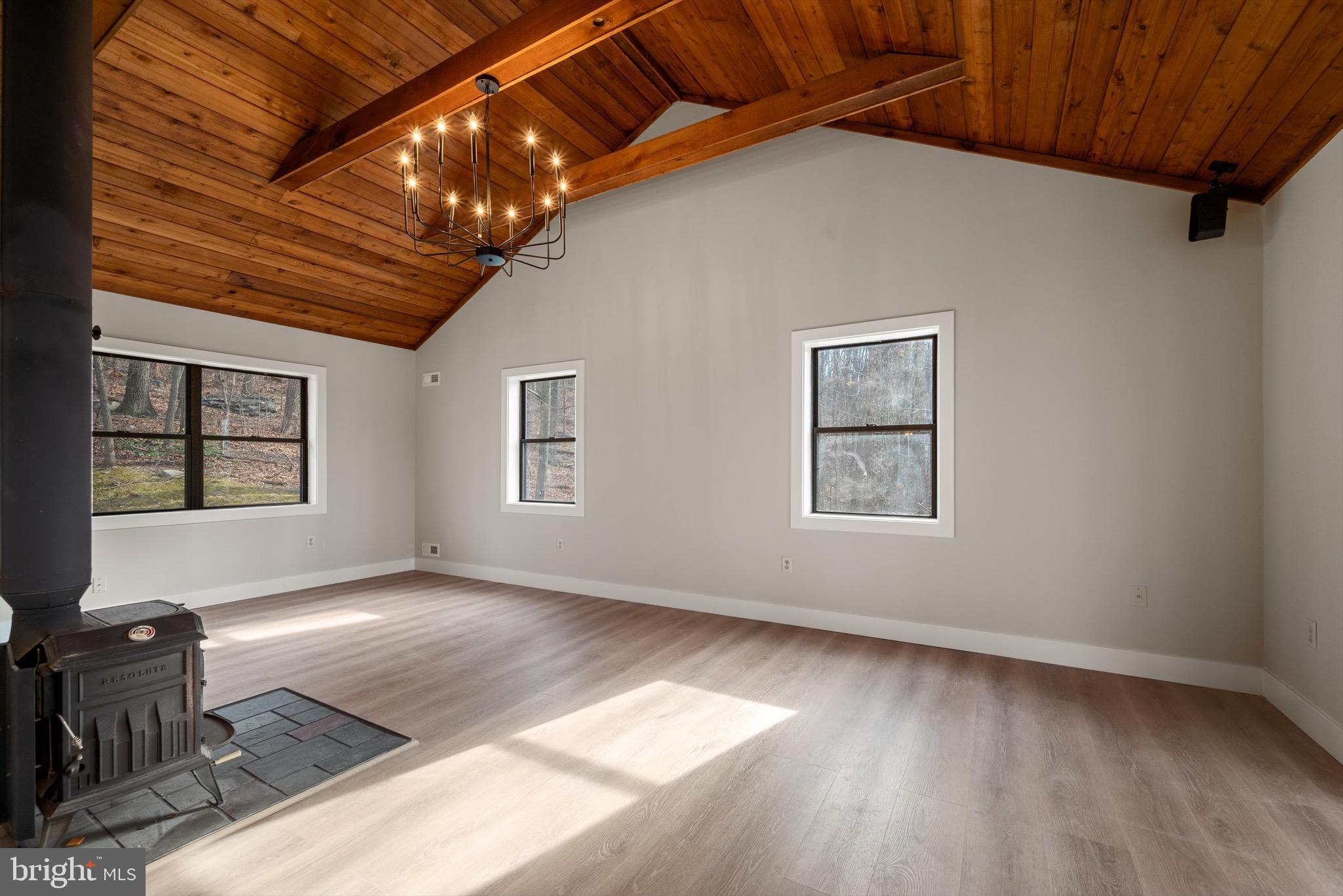 The family room is a highlight, with its cathedral ceiling adorned with wood planks, creating a warm and inviting atmosphere. Enjoy the mountain views from the screened-in porch or the deck.