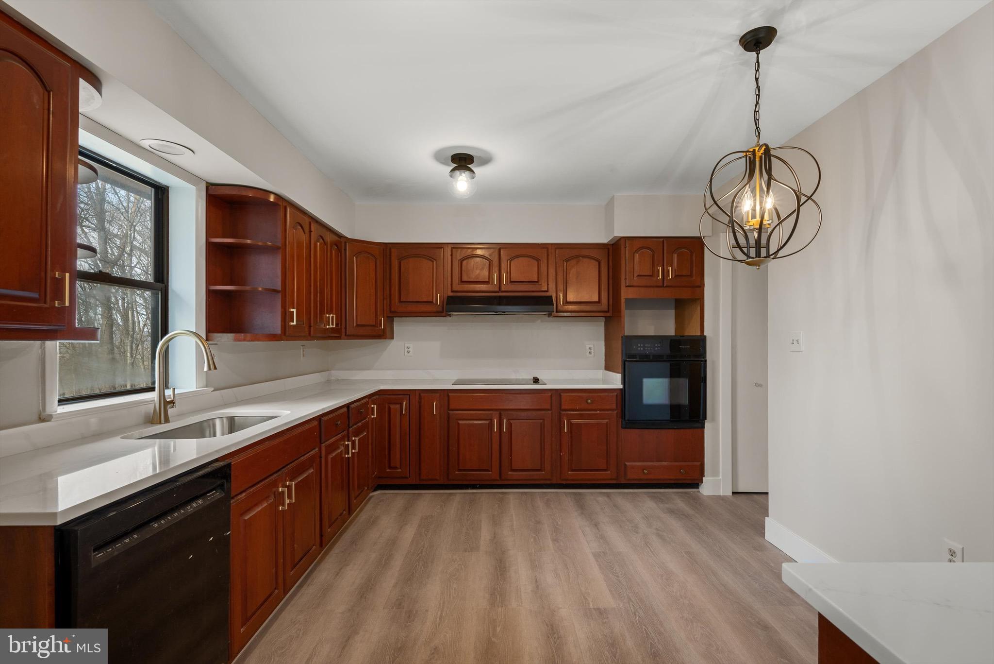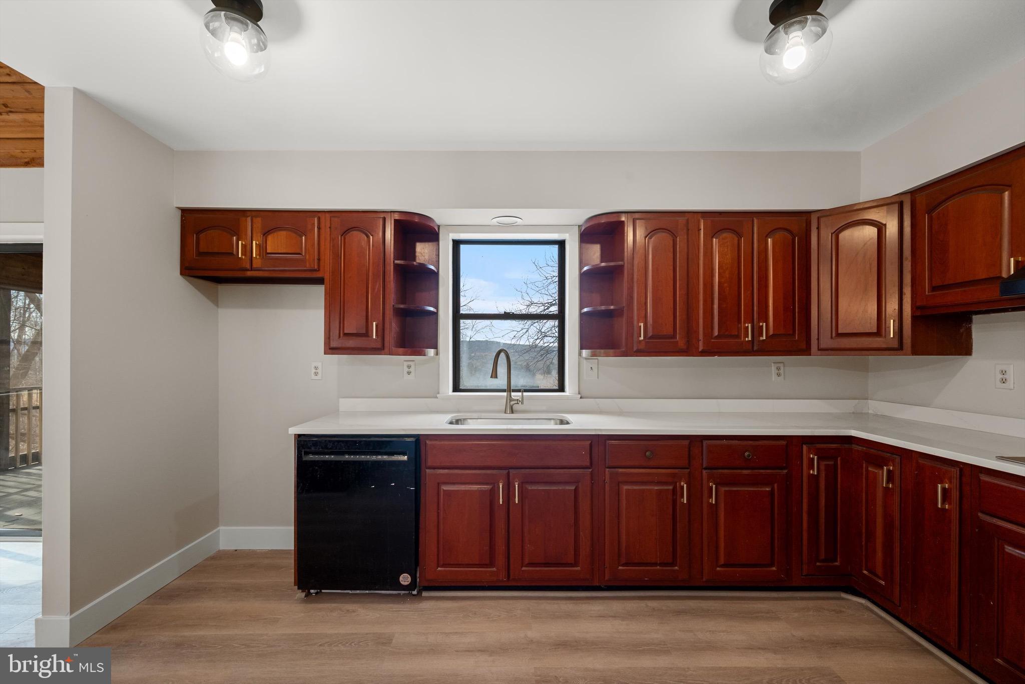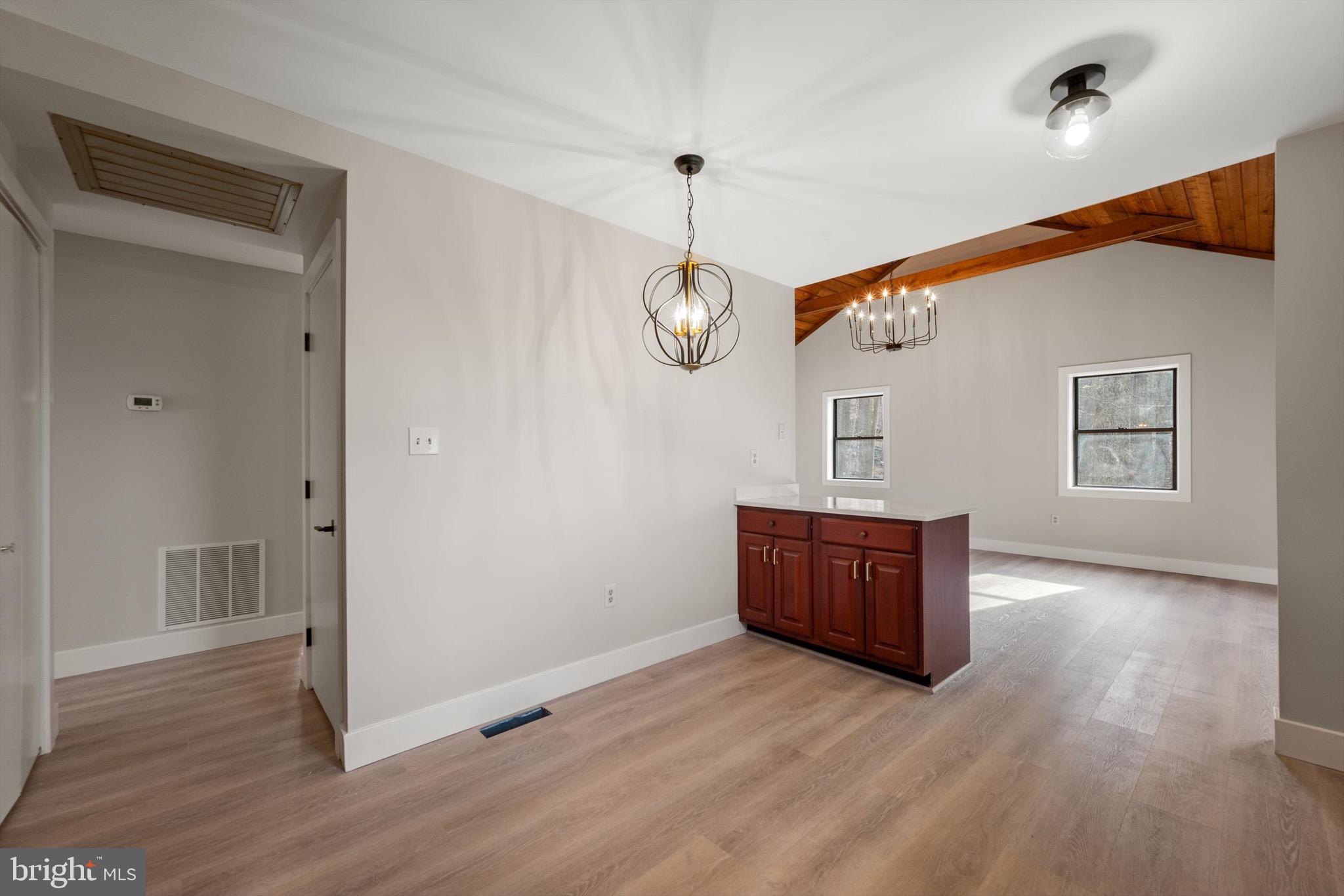 Recent updates include luxury vinyl plank flooring, quartz counters, new vanities, toilets, lighting, trim, exterior stain, interior paint..., The kitchen boasts quartz countertops, and the main level features new LVP flooring. The main level includes a spacious bedroom with a walk-in closet, full bath, kitchen and family room.